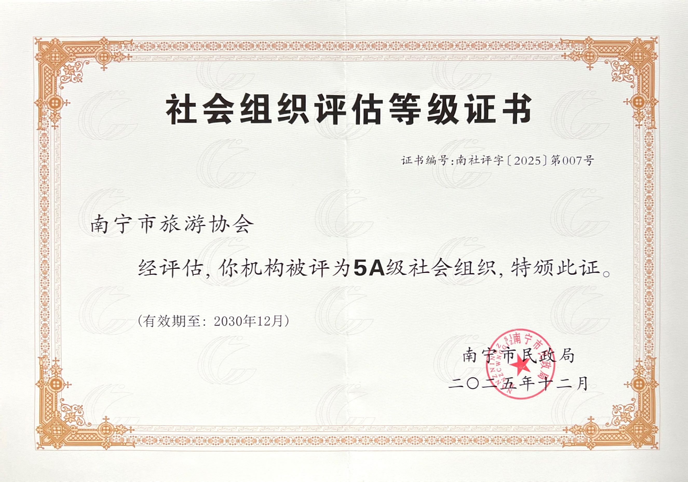 南宁市旅游协会5A级社会组织证书